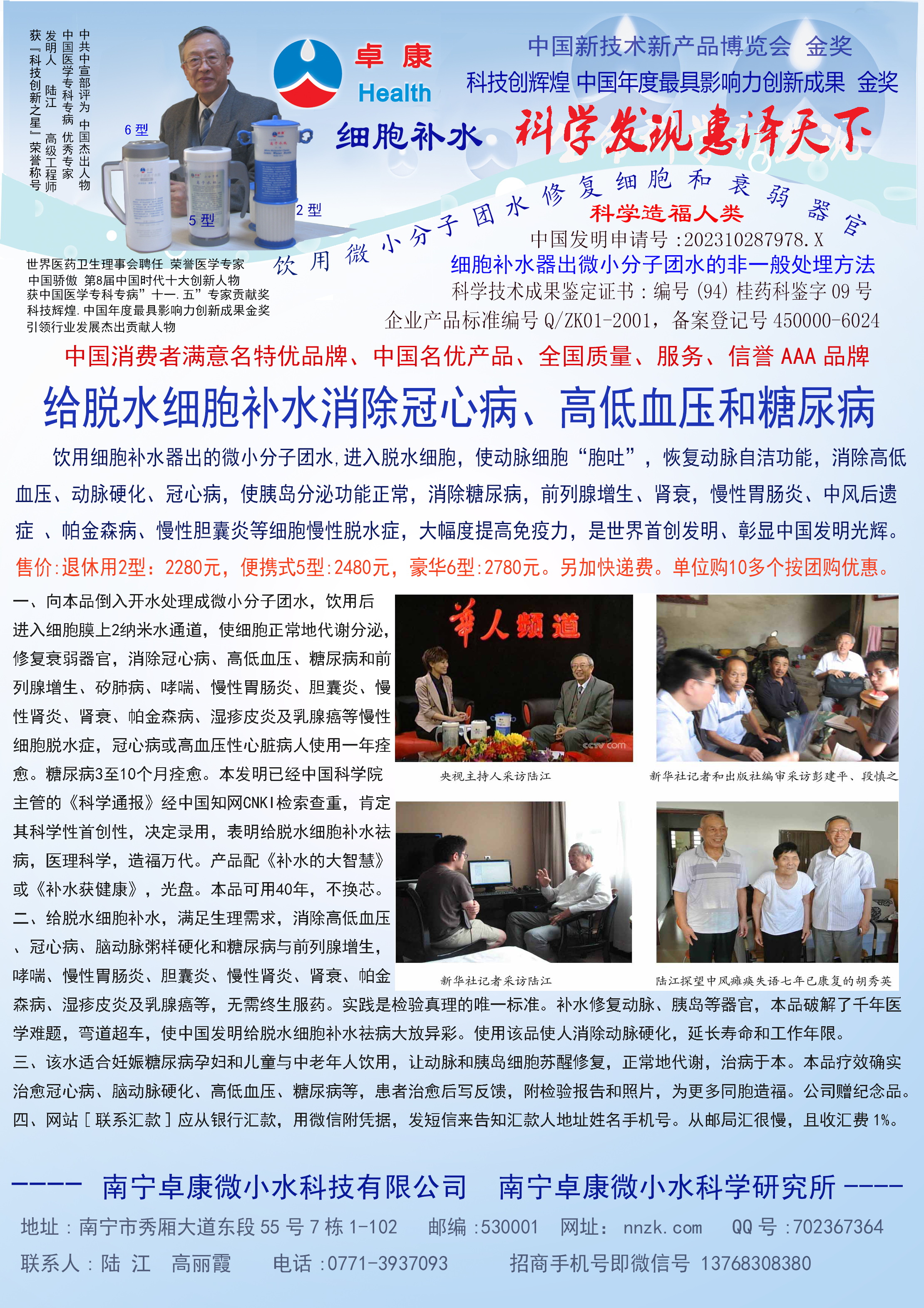 人類幾千年來患以上病癥需終生服藥,幾十年也不能治愈。可是我國南寧的高級工程師陸 江,于1990年想根治高血壓,研究發(fā)明了離子水瓶,處理出微小分子團水供飲用,經(jīng)過醫(yī)院臨床試用和專家鑒定,1999年獲中國發(fā)明專利權,產(chǎn)品于2000年投放市場后一直跟蹤調(diào)查,據(jù)全國各地用戶反饋:祛除了高低血壓、糖尿病和冠心病,并使前列腺增生、咽喉炎、鼻竇炎、慢性氣管炎、支氣管炎、矽肺病、哮喘、慢性胃炎、腸炎、慢性膽囊炎、慢性腎炎、腎衰、膀胱炎、便秘、痔瘡、風濕性關節(jié)炎和濕疹皮炎及中風后遺癥等病癥不藥而愈。為什么喝微小水能治20多種???陸 江從1991年德國科學家發(fā)現(xiàn)細胞膜水通道僅為2納米獲得啟發(fā),認為多種器官患病是因細胞脫水,不能正常代謝和分裂增殖,才使器官細胞減少致衰弱萎縮而形成細胞缺水性病癥。22年來的實踐有力地支持了“細胞脫水致病”這一重要論點,表明喝微小水可滿足細胞的生理需求,補水就能祛病,是生命科學新亮點。